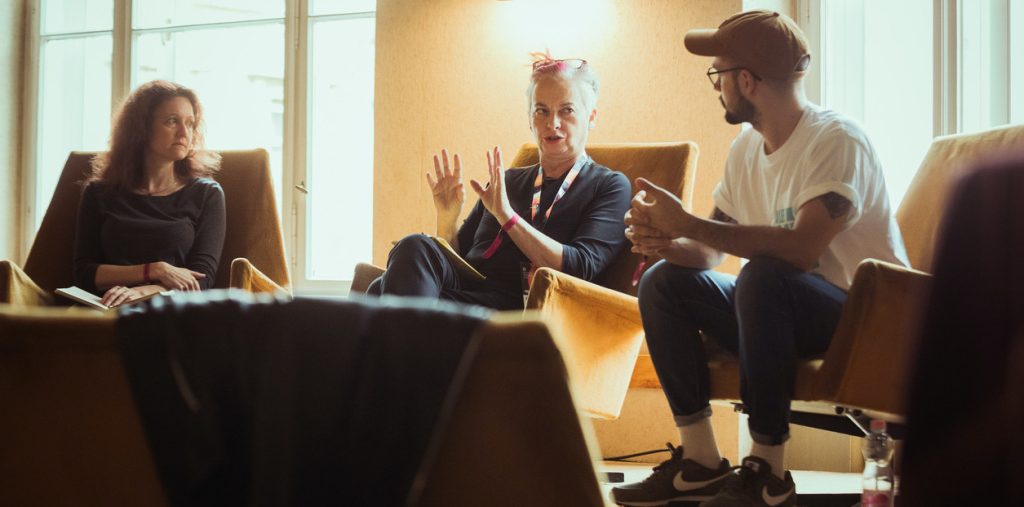 Sally Anne Gross, in discussion with Emília Barna and Dávid Bali at the BUSH showcase festival in Budapest (Photo by sinco)
