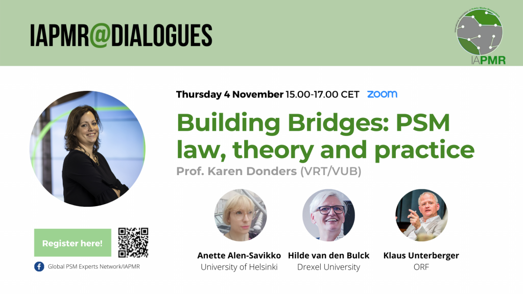 Karen Donders (VRT) and the commentators Anette Alen-Savikko (University of Helsinki), Hilde Van Den Bulck (Drexel University), and Klaus Unterberger (ORF) will be in charge of the second IAPMR@Dialogue, Building Bridges: PSM law, theory and practice. In this webinar they will discuss the practices of #PSM across Europe, including the rules that govern Public Service Media at both the EU and the National Member State level. They will also explore challenges to the theories of #PublicServiceBroadcasting which have developed an ideal-type public broadcaster based on the well-funded BBC in an atypical media market. Seeking to further explore the actual practices of Public Service Media and make recommendations for the development of more sustainable policies, this webinar will highlight case studies of rules and practices from across a variety of EU Member States to consider the extent to which public broadcasters are making the transition to public media.