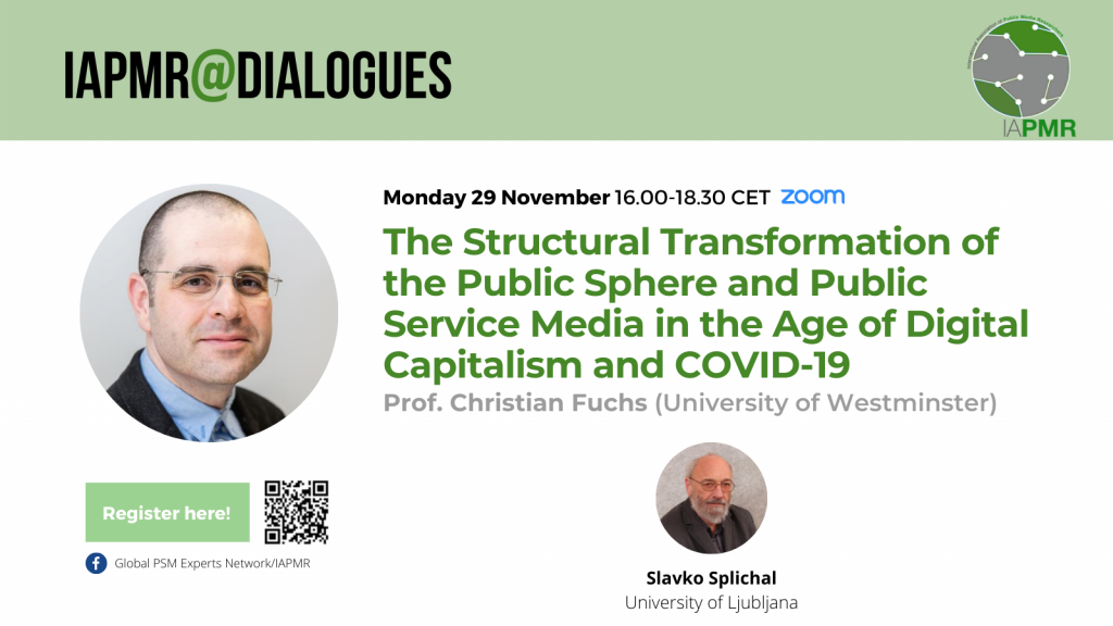 For the third of this season’s IAPMR@Dialogues, prof. Christian Fuchs will be speaking about “The Structural Transformation of the Public Sphere and Public Service Media in the Age of Digital Capitalism and COVID-19”, a webinar that will be joined by prof. Slavko Splichal (University of Ljubljana) as a respondent.